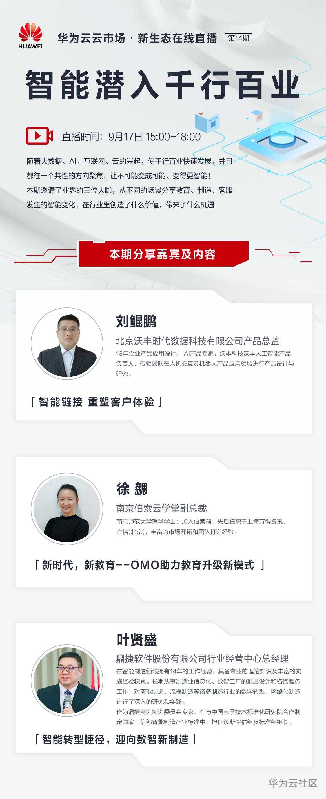 2020年9月17日,华为云云市场邀请了严选商城优质生态伙伴沃丰科技Udesk参加华为云云市场·新生态在线直播活动!本期直播的主题为“智能潜入千行百业”。