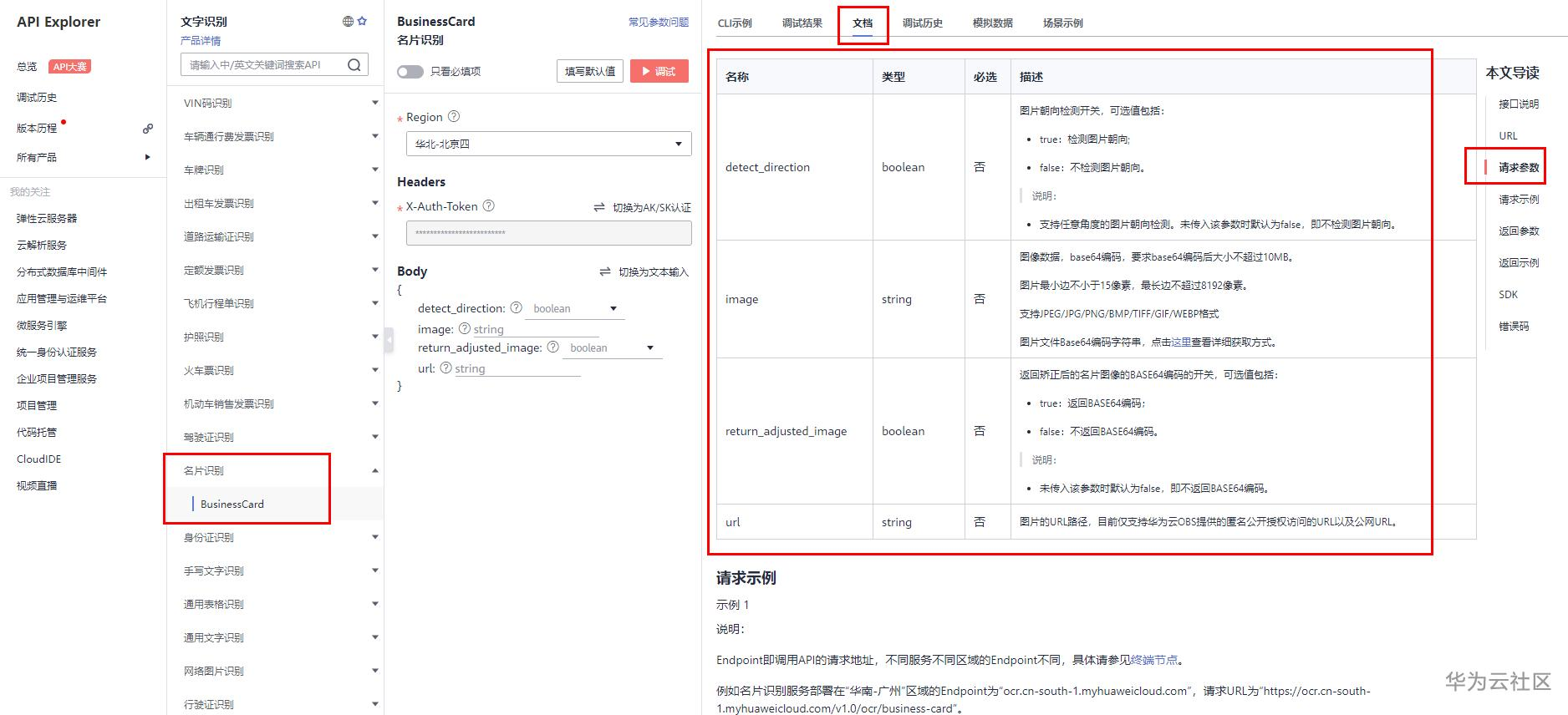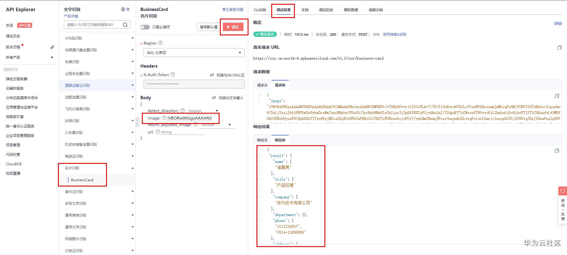 这还不好解决么,说着我掏出手机,打开浏览器进入了华为云API Explorer,搜索“名片识别”,找到对应API,按照接口说明把调用方式发给了发不脱,可不就几行代码的事么。