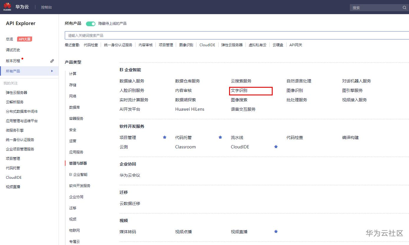 在API Explorer点击文字识别。