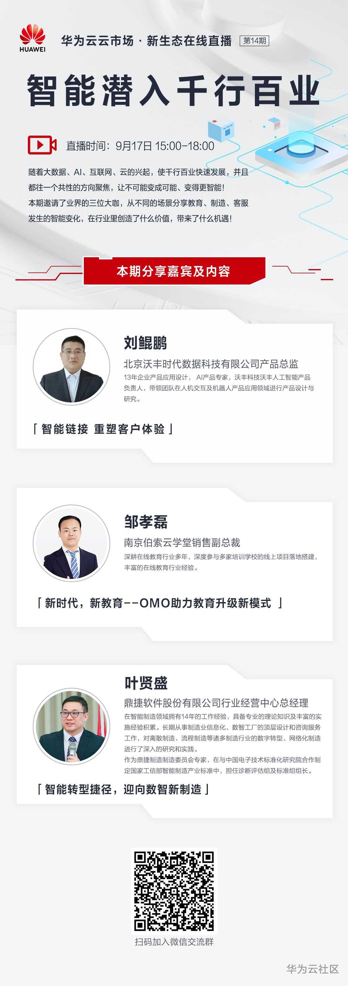 本期话题,华为云将携手沃丰科技UDesk、南京伯索云学堂、鼎捷软件的三位行业大咖齐聚一堂为您带来精彩演讲,从不同的业务场景分享智能客服、教育、制造等领域发生的智能变化,为行业创造了哪些新价值,为企业带来了哪些新机遇!请锁定《智能潜入千行百业》。