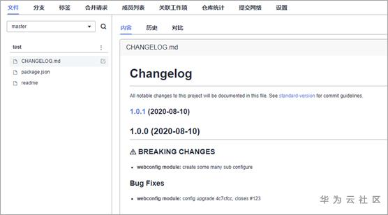 当开发者在本地完成代码开发后,可以使用commitizen与stardard-version规范化代码提交说明,并形成changelog与版本号,然后将代码推送至DevCloud的代码仓库中,触发DevCloud流水线,完成软件发布。