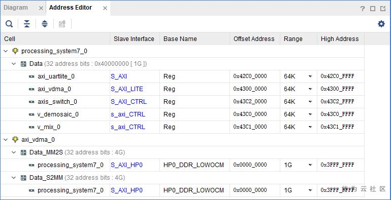点击Address Editor选项,可以看到IP核分配的地址,在PS端可以通过配置这些地址(寄存器)来控制IP核。