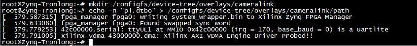 Target# echo -n "pl.dtbo" > /configfs/device-tree/overlays/cameralink/path