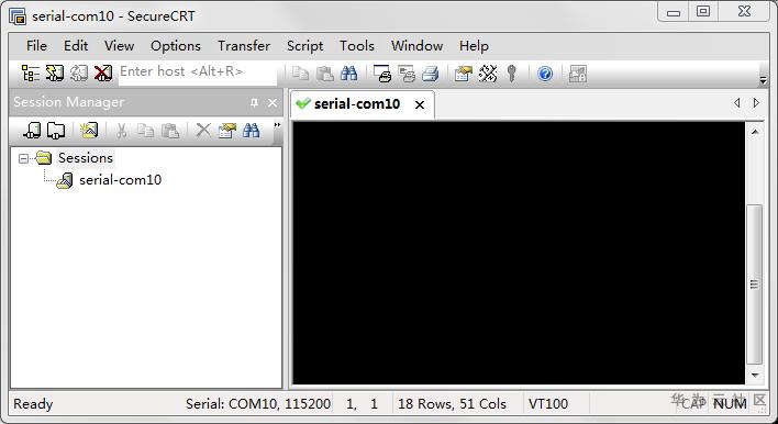 打开串口调试终端SecureCRT,选择对应的COM端口号,设置波特率为115200,8N1,无检验位。建立串口连接,如下图所示。