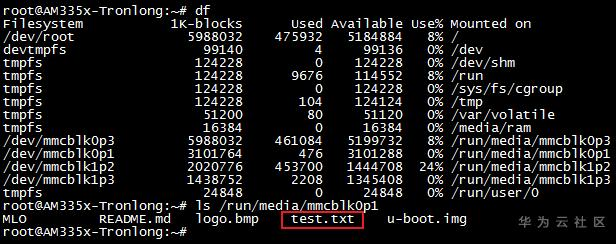 将系统启动卡插到评估板,启动系统并执行如下命令查看分区信息。系统启动卡的BOOT分区挂载在评估板文件系统”/run/media/mmcblk0p1”目录下。