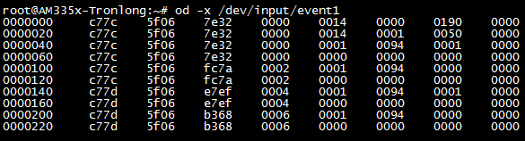 从上图中可以看到按键事件号为event1,执行如下命令,按下KEY5进行按键测试,可看到如下打印信息。按”Ctrl+C”可终止测试命令。