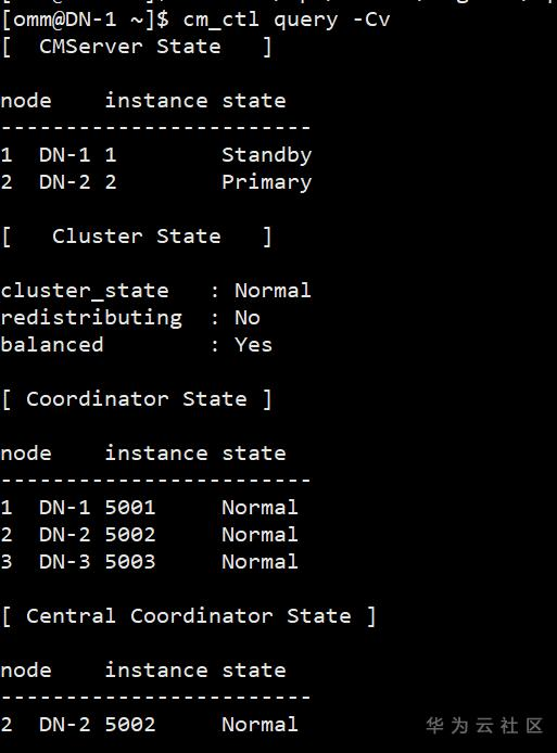 su - omm source /opt/huawei/Bigdata/mppdb/.mppdbgs_profile cm_ctl query -Cv