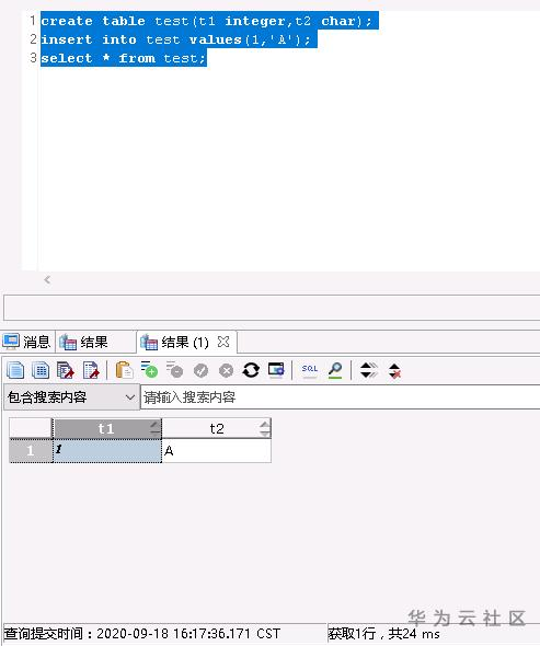 create table test(t1 integer,t2 char); insert into test values(1,'A'); select * from test;