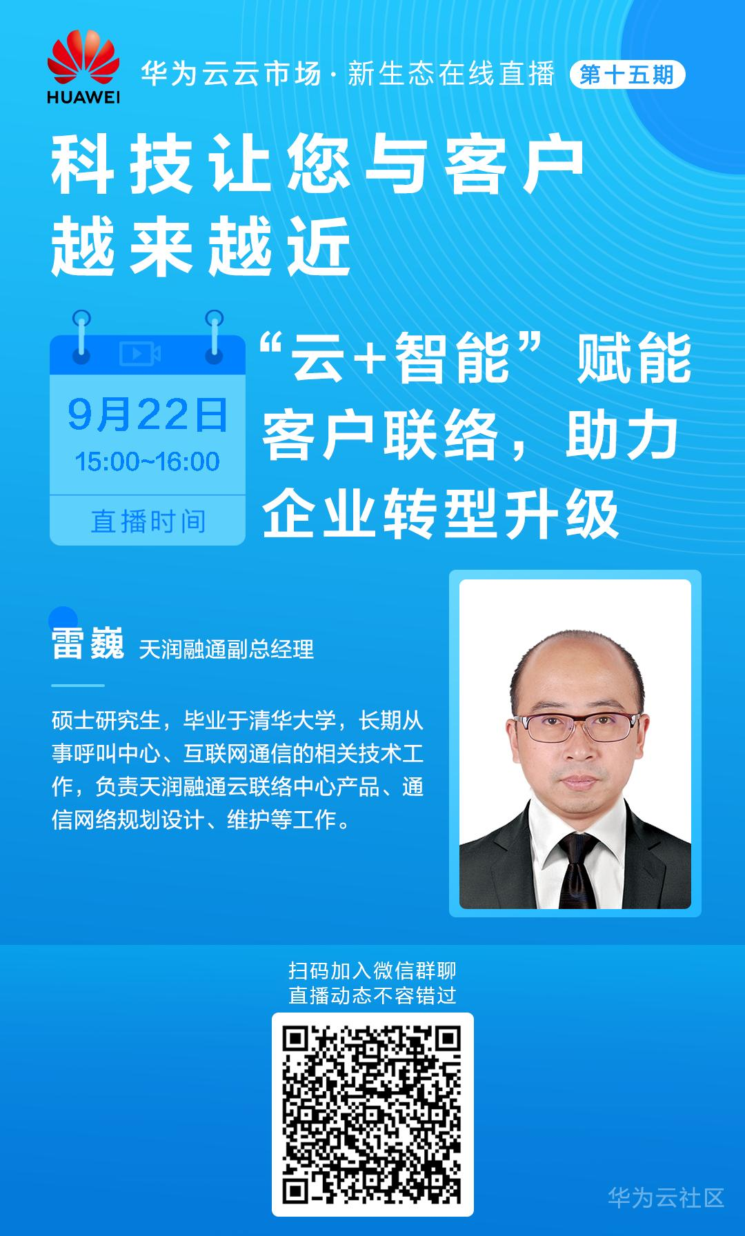 9月22日,华为云云市场·新生态在线直播第十五期“科技让您与客户越来越近”主题直播正式拉开帷幕。天润融通做为华为云唯一智慧云联络中心战略合作伙伴,将分享主题《线上线下融合一体化客户联络场景,助力企业数字化智能化运营》及知名企业客户联络中心应用案例。