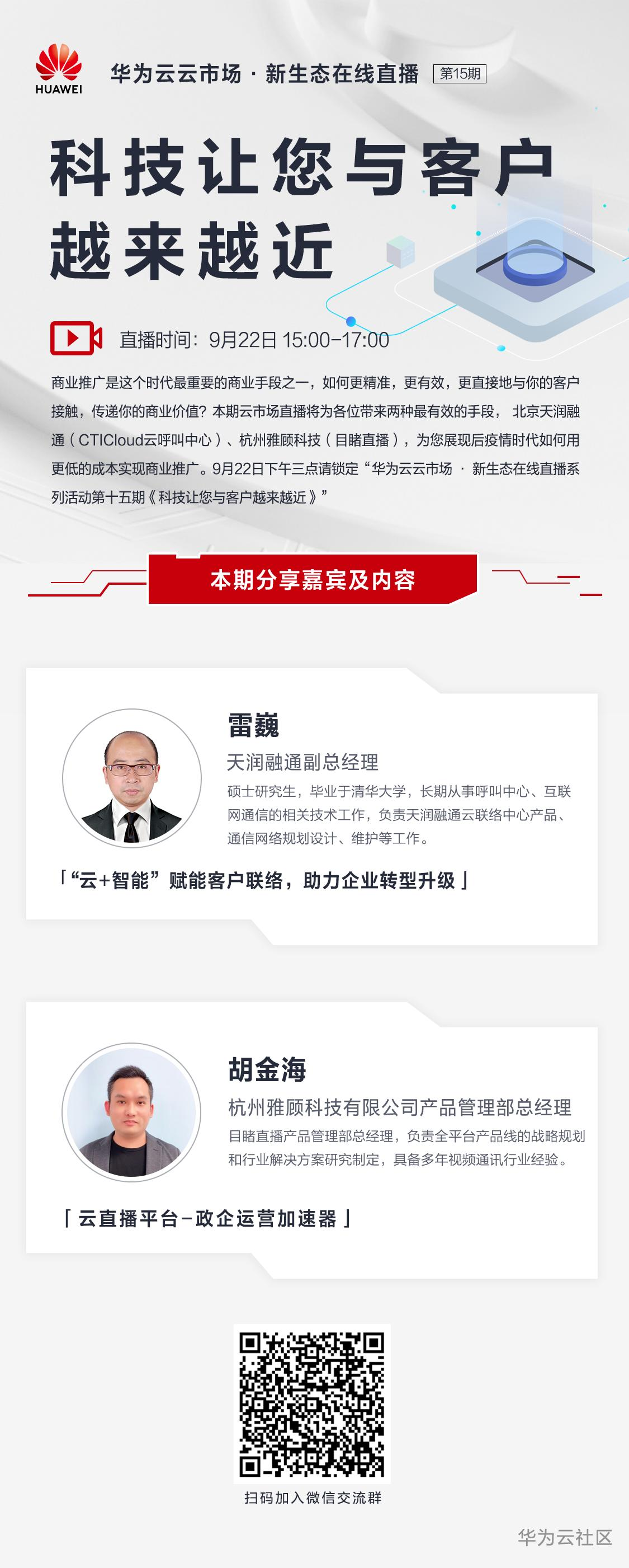商业推广是这个时代最重要的商业手段之一,如何更精准,更有效,更直接地与你的客户接触,传递你的商业价值?本期云市场直播将为各位带来两种最有效的手段, 北京天润融通(CTICloud云呼叫中心)、杭州雅顾科技(目睹直播),为您展现后疫情时代如何用更低的成本实现商业推广。9月22日下午三点请锁定云市场直播间《科技让您与客户越来越近》。