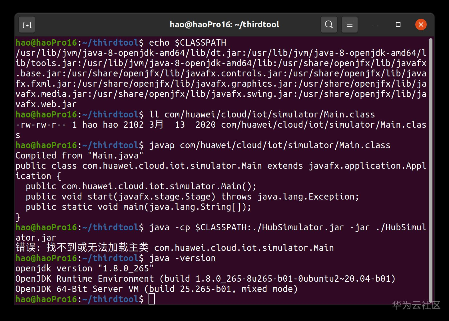 问题是是这样的,按照手册说明在windows是双击,那在linux只能自己运行命令: java -jar HubSimulator.jar(因为Linux下双击默认操作是解压),却报错:找不到或无法加载主类com.huawei.cloud.iot.simulator.Main。我把jar包解开,这个Main.class明白的就在那里!那是CLASSPATH没设置好?我按照手册设置了又设置,担心拼写文字错误,检查了又检查,又不断的调整执行命令进行尝试,一遍又一遍,结果还是这样,我无法停止去不断尝试,就好像答案就在眼前,再抓一把就能抓到,却总是抓丢了。我真的很郁闷。仿佛陷入了一个泥潭,虽然我知道需要跳出来,也许什么都不做,再理一下思路,就能豁然开朗,却就是无法自拔。