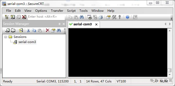 打开串口调试终端SecureCRT,选择对应的COM端口号,设置波特率为115200,8N1,无检验位。建立串口连接,如下图所示。
