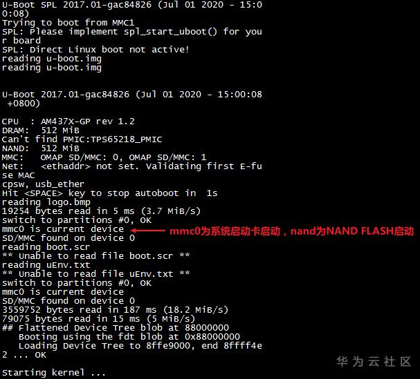 将Linux系统启动卡插入评估板Micro SD卡槽,根据评估底板丝印将拨码开关拨为00110(1~5),此档位为SD卡启动模式。将评估板上电启动,串口终端会打印以下类似启动信息。