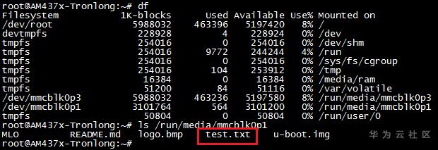将系统启动卡插到评估板,启动系统并执行如下命令查看分区信息。系统启动卡的BOOT分区挂载在评估板文件系统”/run/media/mmcblk0p1”目录下。