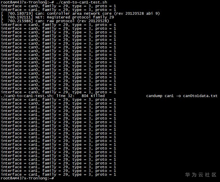 将产品资料“4-软件资料\Demo\platform-test-demos\can_test”文件夹下的两个脚本程序canconfig-can0-1.sh和can0-to-can1-test.sh拷贝到评估板文件系统任意路径下。在脚本程序所在路径执行如下命令运行脚本程序,测试CAN接口通信功能。