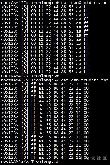 打开当前目录下生成的can0to1data.txt和can1to0data.txt文件,查看文件内容数是否和下图一致。如一致则表示CAN通信功能正常。