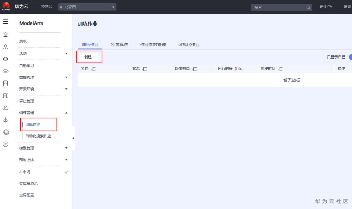 进入modelarts首页选择训练作业,创建