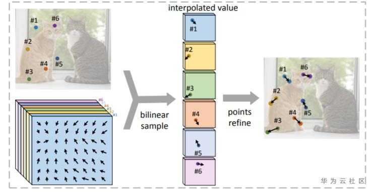 RepPoints对物体轮廓点的偏移量进行修正时(图2),是先基于初始预测的N个轮廓点,通过N个Deformable Conv 算子分别对每个轮廓点进行修正预测,所需复杂度为O(n^2)。该方法对于预测密集点的Dense RepPoints算法而言,在推理效率上就不适用了。Dense RepPoint提出Shared offset fields方法,认为对每个轮廓点的偏移修正特征只需从原始预测的轮廓点信息,即每个轮廓点各自进行独立的修正,从而将复杂度降低到O(n)。具体如图7所示,对每个轮廓点通过bilinear线性插值方法提取特征进行轮廓点修正。