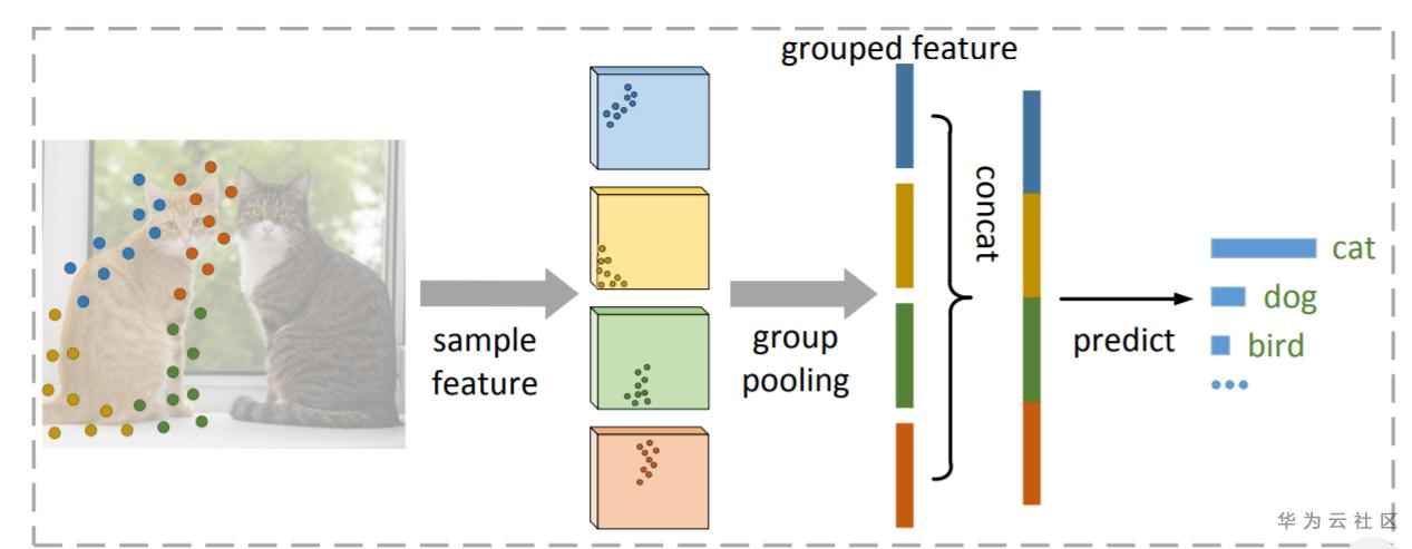 Group Pooling如图6所示,主要解决分类过程中的复杂度。如果实验中采用n点来描述目标,那么将其分成k组,对每组进行池化操作,然后进行预测,最终分类部分的复杂度有O(n)降低到O(k)。