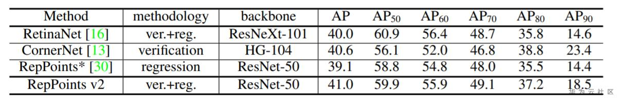 验证(即分割)和回归是神经网络两类通用的任务,有着各自的优势:验证更容易学习并且准确,回归通常很高效并且能预测连续变化。因此,采用一定的方式将两者组合起来能充分利用它们的优势。RepPoints V2就是在RepPoints的基础上增加了验证模块,实现了性能的进一步提升。该论文工作有一定的可拓展性,在基于回归的方法上都可以加上这个模块以提升结果。