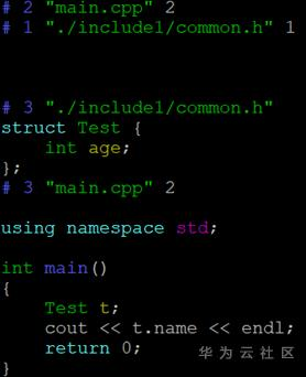 成员的文件(所在目录为./include),但在编译过程中中间的common.h(所在目录为./include1)抢先被发现,导致编译器报错:Test结构没有name成员,对程序员来讲,自己明明定义了name成员,居然说没有name这个成员,如果第一次碰到这种情况可能会怀疑人生。应对这种诡异的问题,我们可以用-E参数看下编译器预处理后的输出,如下图。