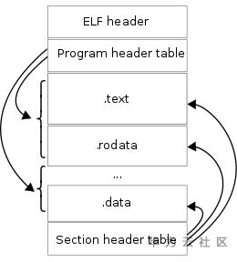 一个典型的ELF文件格式如下图所示,文件有两种视角:编译视角,以section头部表为核心组织程序;运行视角,程序头部表以segment为核心组织程序。这么做主要是为了节约存储,很多细碎的section在运行时由于对齐要求会导致很大的内存浪费,运行时通常会将权限类似的section组织成segment一起加载。