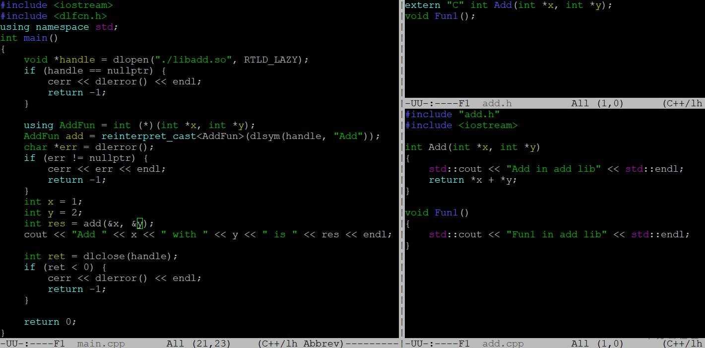如下代码演示了动态加载Add函数的过程,add.cpp按照正常编译“g++ -fPIC –shared –o libadd.so add.cpp”成libadd.so,main.cpp通过“g++ main.cpp -ldl”编译为a.out。main.cpp中首先通过dlopen接口取得一个句柄void *handle,然后通过dlsym从句柄中查找符号Add,找到后将其转化为Add函数,然后就可以按照正常的函数使用,最后dlclose关闭句柄,期间有任何错误可以通过dlerror来获取。