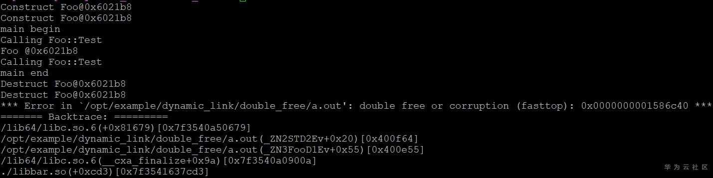 运行a.out会导致double free的错误。这是由于在一个位置上调用了两次析构函数造成的。之所以会这样是因为链接的时候先链接的静态库,将foo_的符号解析为静态库中的全局变量,当动态链接libbar.so时,由于全局已经有符号foo_,因此根据全局符号介入,动态库中对foo_的引用会指向静态库中版本,导致最后在同一个对象上析构了两次。