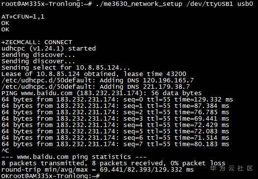 进入评估板文件系统,在me3630_network_setup文件所在路径下执行如下命令测试网络功能是否正常。