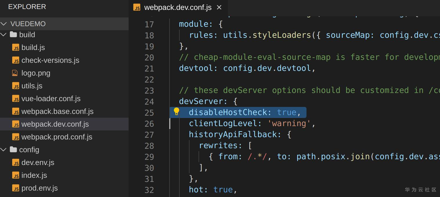 (修改地址:build/webpack.dev.conf.js > devServer: > disableHostCheck:true 因为我们是用npm run dev运行的,所以修改build/webpack.dev.conf.js文件)