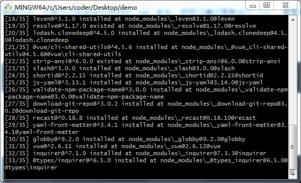 选定路径,新建vue项目,这里我是在桌面上新建了demo文件夹,cd目录路径
