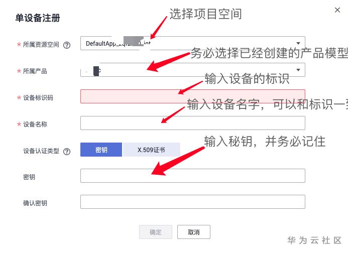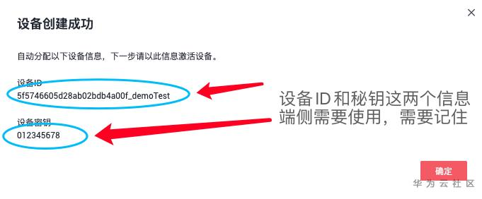 当产品模型创建完毕之后,我们可以创建基于该产品模型的设备。设备-->注册设备。根据对话框填写对应的信息。本文为了方便创建的设备标识为demoTest,秘钥为012345678(该设备已经删除,请勿连接)。结果如下: