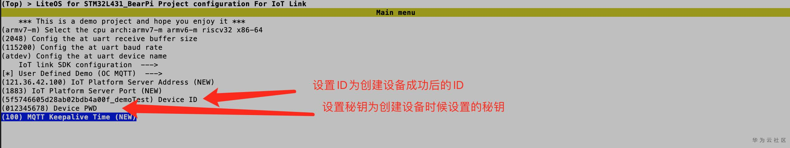 设置AT串口波特率和模组匹配;设置设备ID和秘钥,其和在IoT平台上创建设备时候的设置一致。