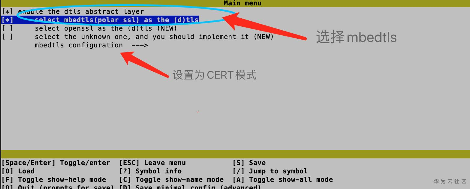 配置MBEDTLS的主要原因是,IoT平台生成MQTT的三元组的时候需要使用到HMAC算法。使能TLS并选择mbedtls并配置为CERT模式。
