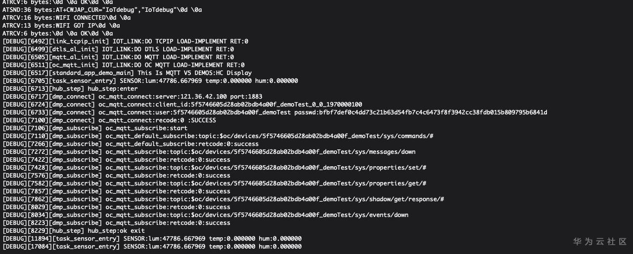同时可以接入串口,设置正确的波特率,会看到系统的输出信息。(wifi连接上并获取IP,向IoT平台订阅主题成功)。