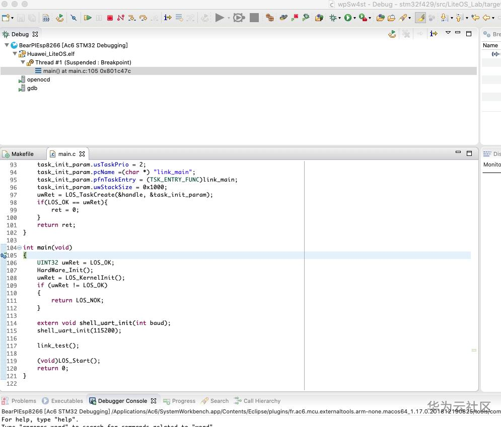 点击apply并debug,可以看到烧录完毕并进入调试界面。
