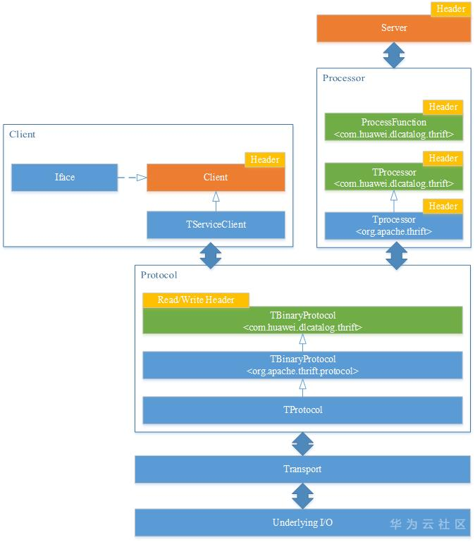 TProcessor(com.huawei.dlcatalog.thrift) 继承至TProcessor,实现对自定义信息Header的读写逻辑,并借助ProcessFunction将自定义信息向下传递给Server接口上下文信息中(基于Iface实现的Handler需要自实现上下文,用于承载自定义信息并实现与请求绑定,避免映射错乱,也避免对服务端接口规范有冲击从而有变动)