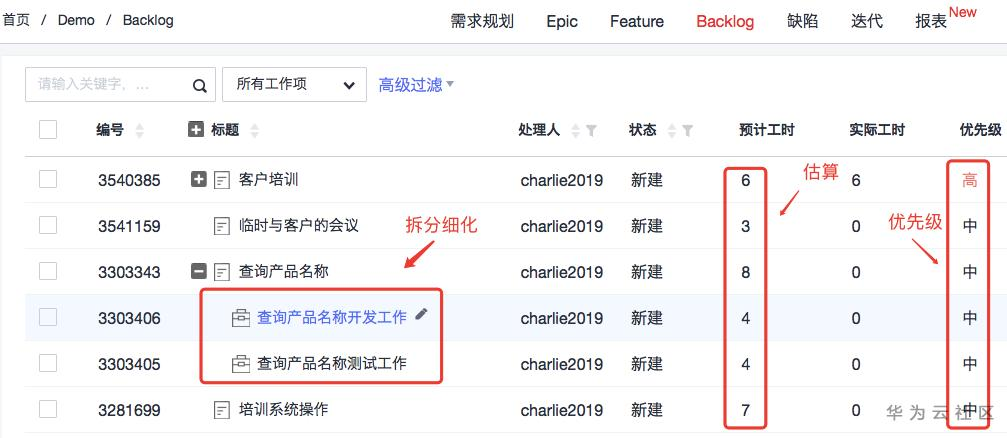 产品经理梳理后,如图高亮部分,突发性培训任务的工作项得到了合理的优先级,同时它是被细化的,而且是经过工作量估算的。