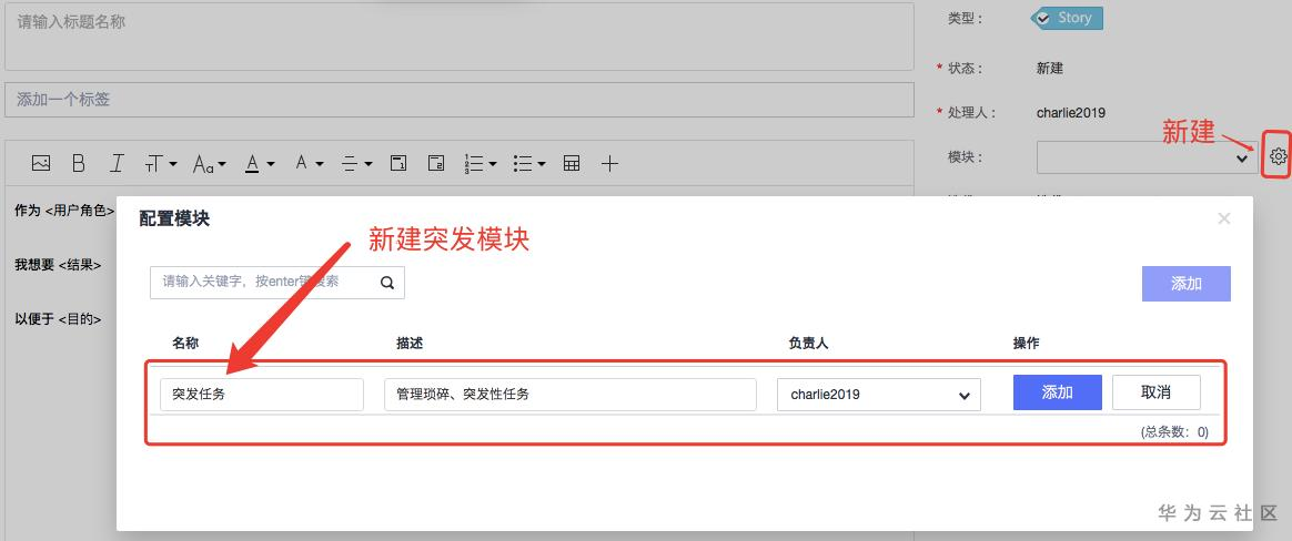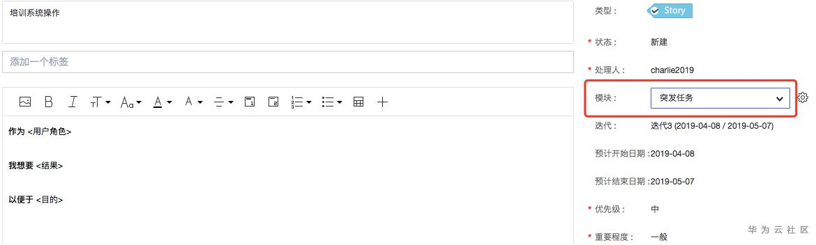 新纳入迭代待办列表的突发性工作项可以在DevCould的“模块”下进行管理。也就是说,在新建User Story之前建立一个“突发任务”模块。这是为了在后续几个迭代中对这类突发性工作进行度量分析,为持续改善做准备。