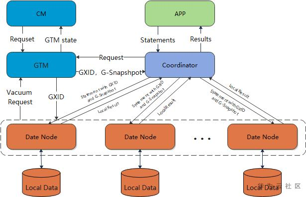 GTM全称为全局事务管理器,是系统中的常驻进程,主要作用是分发xid(事务ID)、snapshot(快照)、sequence(序列)等信息。为了保证事务标识的一致性和全局唯一性,在集群中只有一个主GTM提供服务,并采用了主备方式,从而实现了高可用。在连接方面,GTM是被动连接的,它不关心连接方的节点类型(是CN还是DN),只会根据接收到的报文信息,进行相应处理,并返回消息。一般情况下,CN会在事务执行阶段连接GTM获取XID和snapshot,DN在AutoVaccumWork时获取XID,CM在仲裁GTM时获取状态信息。GTM在架构中的关系如图1所示。