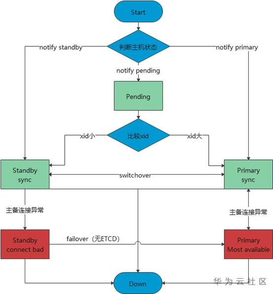 GTM的状态切换流程如图2所示。CM拉起的GTM状态初始都是Pending状态,然后通过比较xid决定主备,xid大的为主GTM,xid小的为备GTM。当主备连接异常且无ETCD时,主GTM的同步状态会变为most_available。当主GTM出现问题时,CM会仲裁备GTM,通过failover升主GTM,如果无ETCD,那么同步状态变为most available。也可以通过switchover进行主备GTM转换,此时同步状态不会变化。