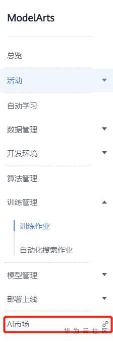 首先在modelarts页面左侧的导航栏中找到AI市场