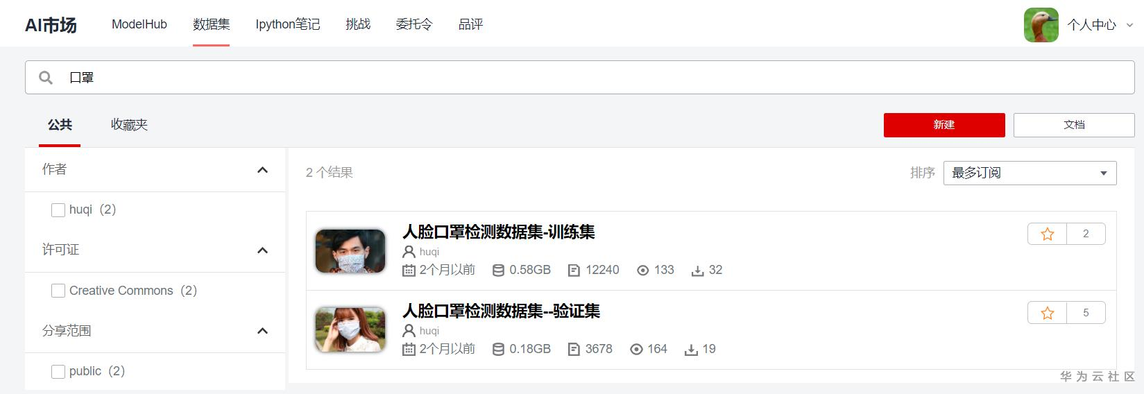 进入到AI市场后,在页面的菜单栏点击数据集,然后在出现的页面搜索框中输入关键词“口罩”就会显示出数据集中所有包含口罩关键词的数据集了,这边有两个,这里我们选择《人脸口罩检测数据集-训练集》作为训练数据加载。