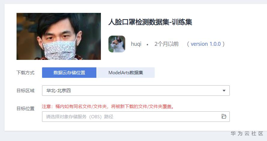 前两天闲逛华为Modelarts AI市场的时候偶然间发现huqi大佬上传的一个有关口罩检测的数据集,突然就想着看见好多大佬写过口罩检测的案例,要不我也玩一把试试。虽然没有大佬们高大上都是自己写代码或者自己找的数据集,我基本都是现成的直接拿来用就行了。不过玩的开心就好,正好复习一下以前在AI实战训练营学到的知识,来一个0代码实现人脸口罩检测。