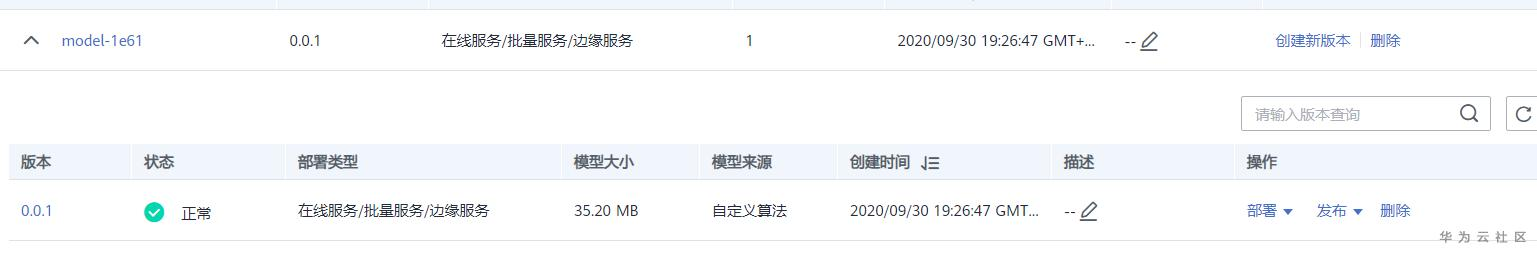 点击模型名左面的箭头会出现模型部署详细信息,等到模型的状态变为正常后就说明模型导入完成了,可以直接点部署->在线服务进行在线服务的部署。