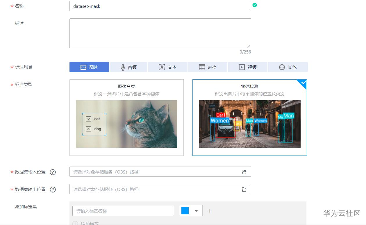 数据集输出位置:在OBS中新建一个文件夹用于存储数据集输出