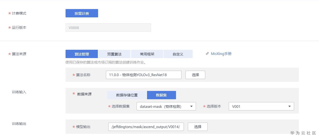 模型输出:这里选择模型训练好的文件需要存储到OBS的那个位置。这里的文件在后面模型训练的时候还会用到