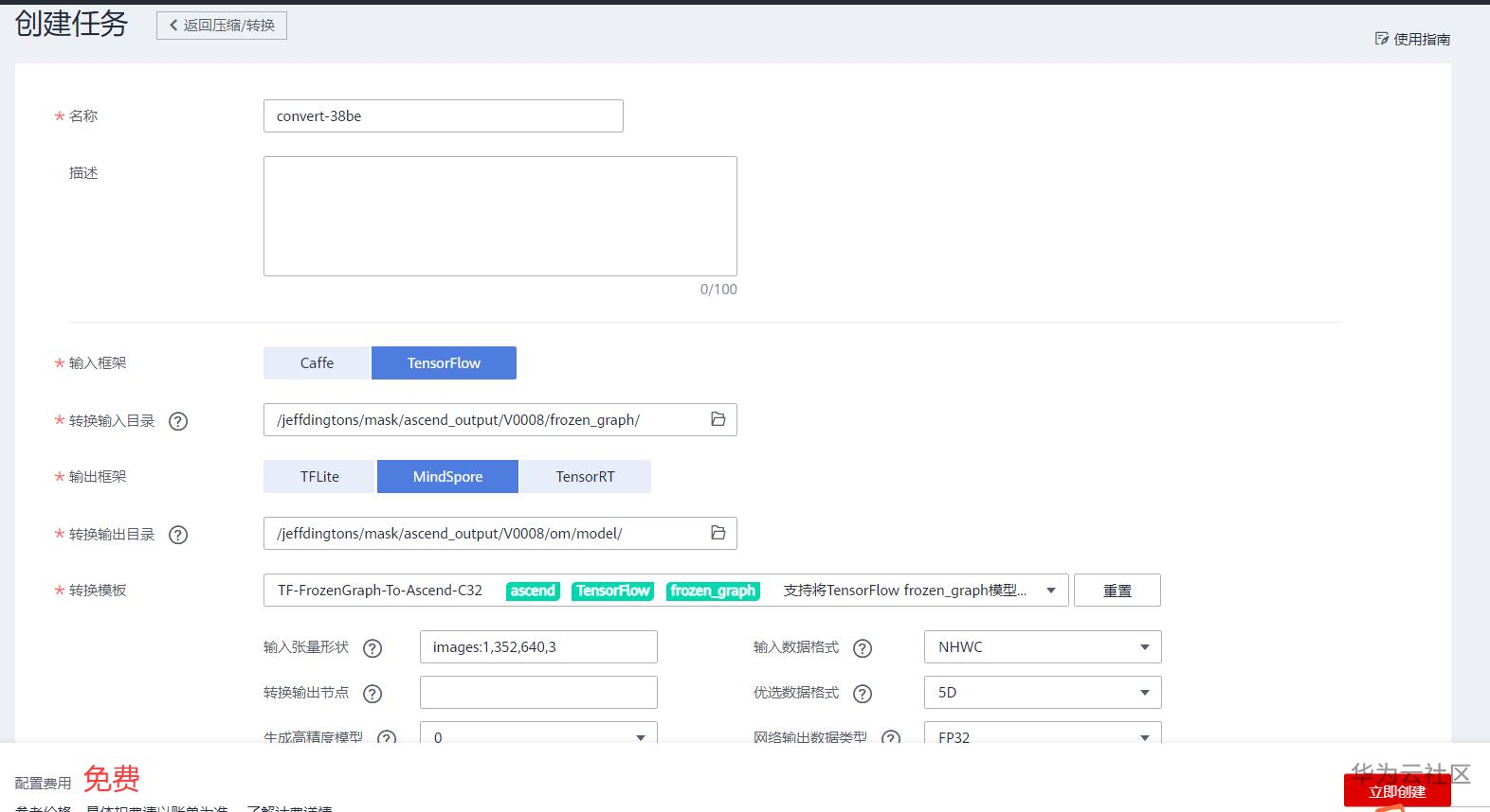 模型训练完成后直接点击创建模型按钮就可以直接进入到创建模型的界面了。但是这个模型直接用CPU或者GPU部署会有点问题,那么于是乎我就计划用昇腾910训练,不如我推理的时候把他转为昇腾310的模型来推理。在Modelarts页面左侧的导航栏选择模型管理->压缩/转换进入到模型转换界面