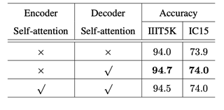 在作者进行的对比试验中,一个比较有意思的现象是,在编码器里面添加Self-attention模块并不能提升模型性能,在解码器中添加才会对结果有提升,如表2所示。这表明原本的Transformer结构直接应用到文字识别任务上是不可行的,需要做相应的调整。