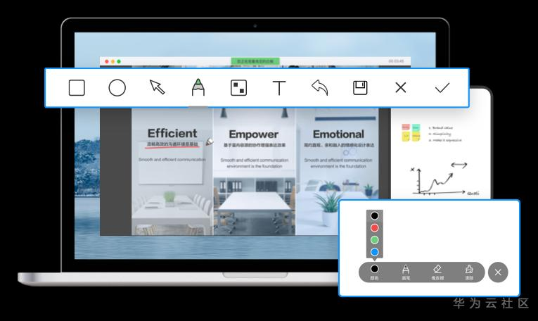 华为云会议可以选择分享屏幕上的所有内容或仅分享某一窗口,这使您拥有对桌面可见性的完全控制并保证了您的隐私。通过共享屏幕,您可以向朋友、同事或客户演示设备上的任何媒体内容,而无需发送任何文件,这包括演示文稿,文档,图像,甚至视频。支持多人在线实时标注,这讨论更加高效。